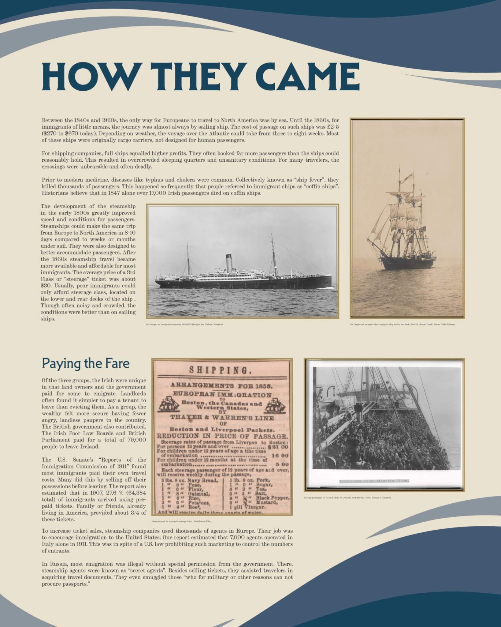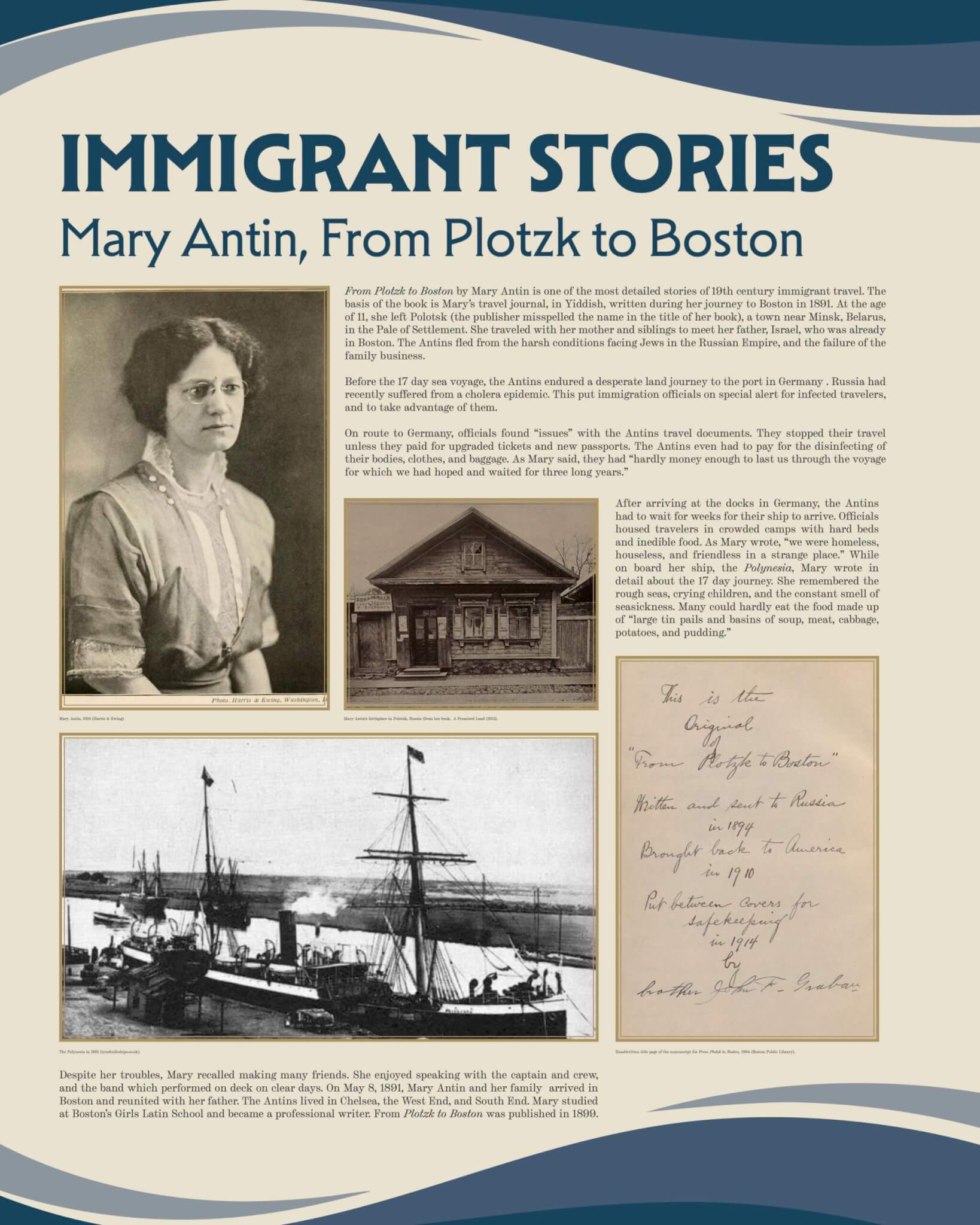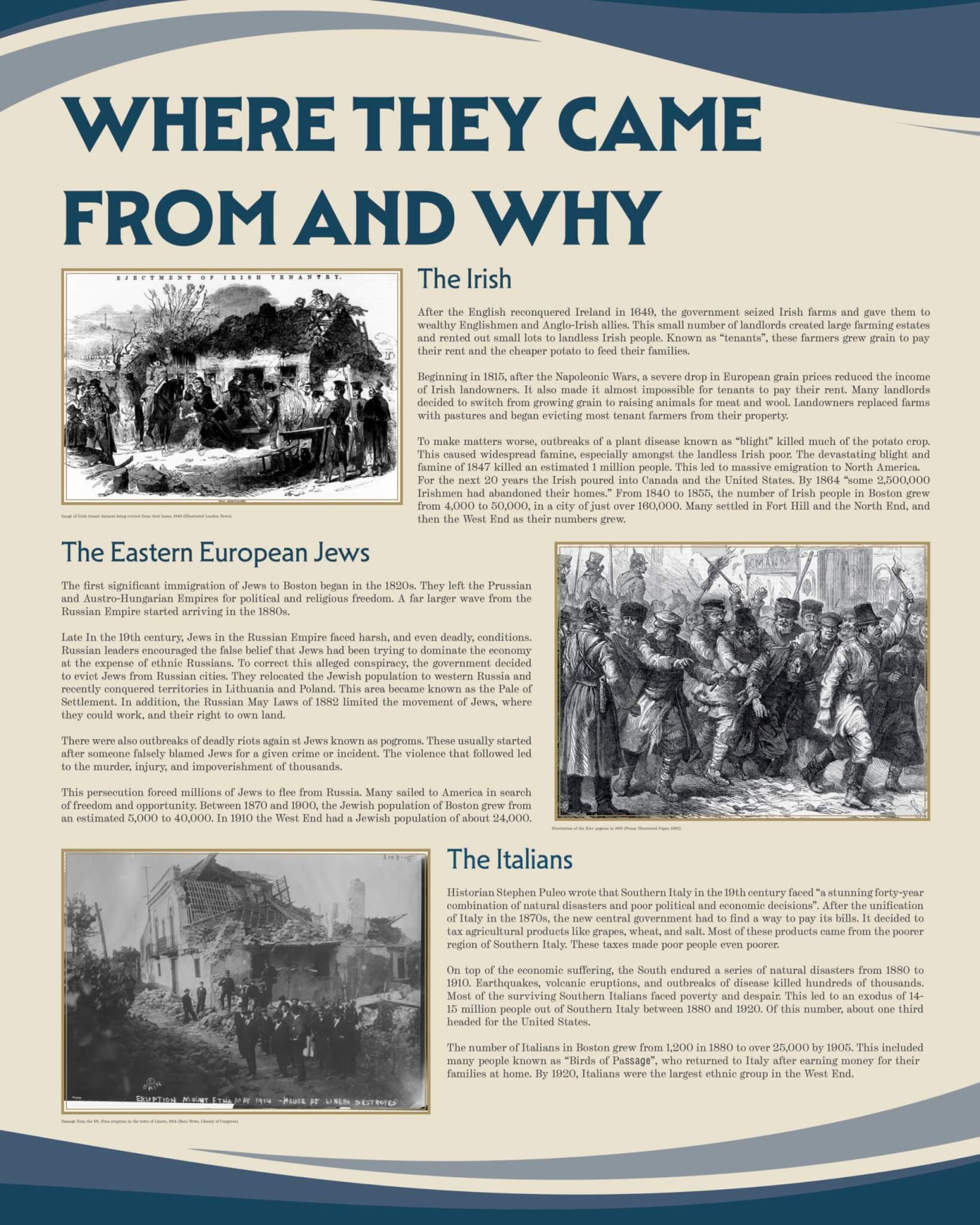 This special exhibit, running between October 2025 through February 2026, explores the perilous but promising journeys of the immigrants traveling to start a new life in Boston. Learn about a century of European immigration through the stories of three of the West End’s major ethnic groups. Find out why they left, how they traveled, and what awaited them on Boston’s shores. From Irish fleeing famine on coffin ships, to Jews seeking religious freedom and security, to Italian families searching for opportunity, every immigrant has a story. This exhibit features a video on the history of American Nativism in Boston, a theme that is more relevant than ever.