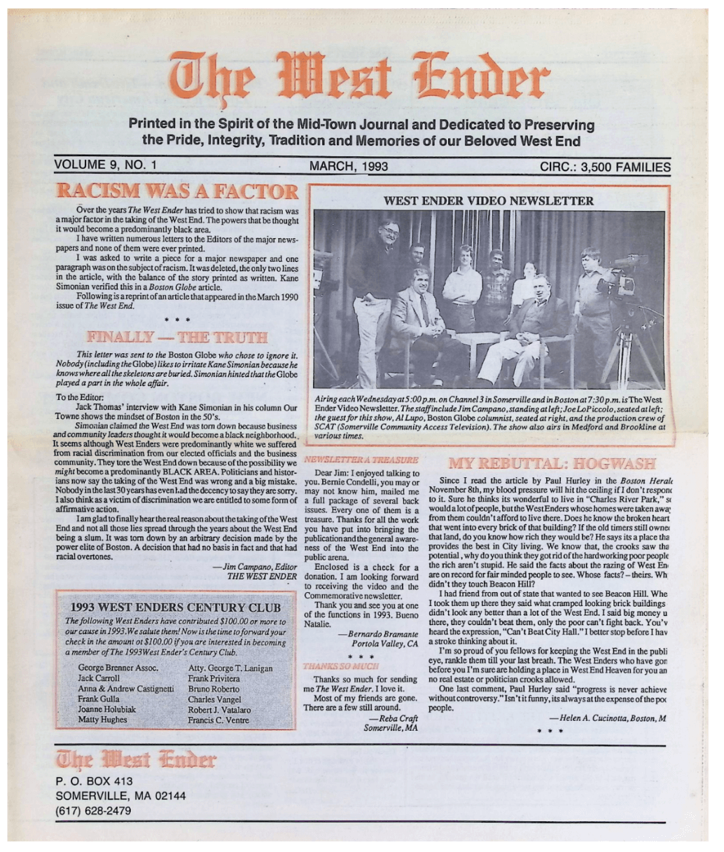 This statement opened up old wounds of former West Enders and made the front page of Campano’s, The West Ender newspaper.