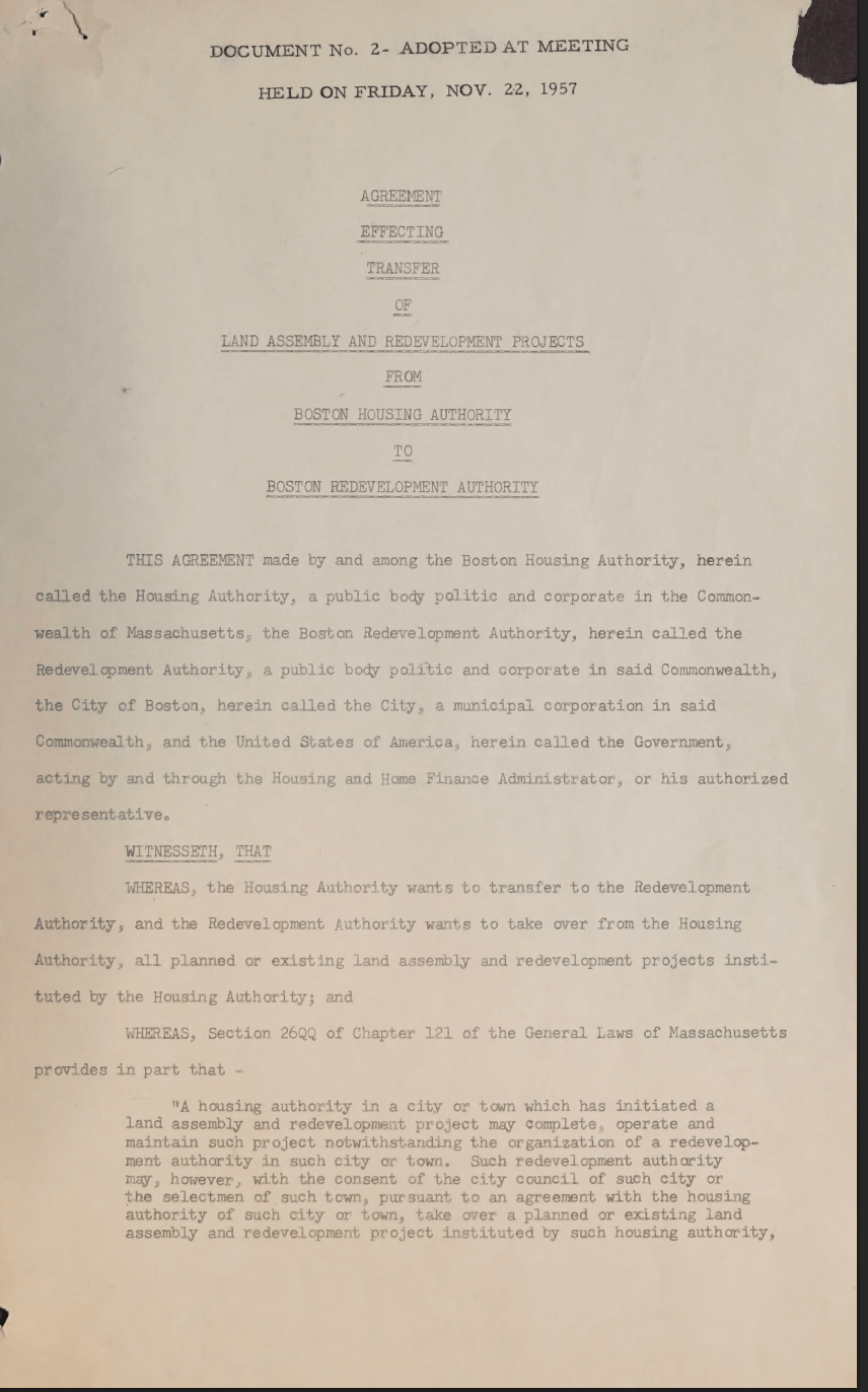 In 1957, under pressure from business leaders dissatisfied with the pace of Boston’s urban renewal program run by the Boston Housing Authority (BHA), Massachusetts lawmakers created a new agency named the Boston Redevelopment Authority (BRA). The BRA would oversee all current and future urban renewal projects and essentially all major land development in Boston. It would be a semi-autonomous agency with board oversight and stronger executive leadership. Kane Simonian, who had led the BHA’s urban renewal department, was named the BRA’s first director.
