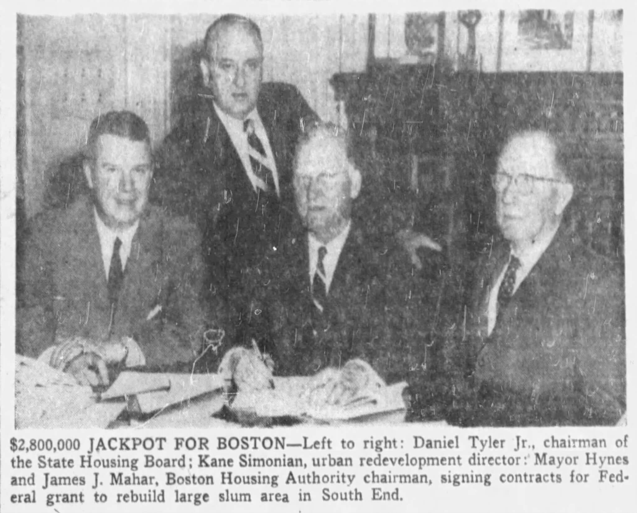 Simonian was born into an ethnic Armenian family in 1912 “by Caesarean section on the kitchen table of his parent’s East Boston apartment.” He earned an undergraduate degree from Harvard University in 1933 and attended Boston College Law School. Simonian served in the U.S. Army during WWII, and worked at the Veterans Administration after the war. In 1946, he joined the BHA as an administrator. Simonian was active in politics. He worked for John F. Kennedy’s congressional campaign in 1947 and John Hynes mayoral campaign of 1949. He was also a close friend of the future U.S. Speaker of the House, Thomas “Tip” O’Neill. Possibly in return for Simonian’s past support, Mayor Hynes appointed him chief of the BHA’s urban renewal and slum clearance operation in 1951. The position paid $7,000 a year, the equivalent of $90,000 in today’s money. In his new position, Simonian had to hit the ground running.