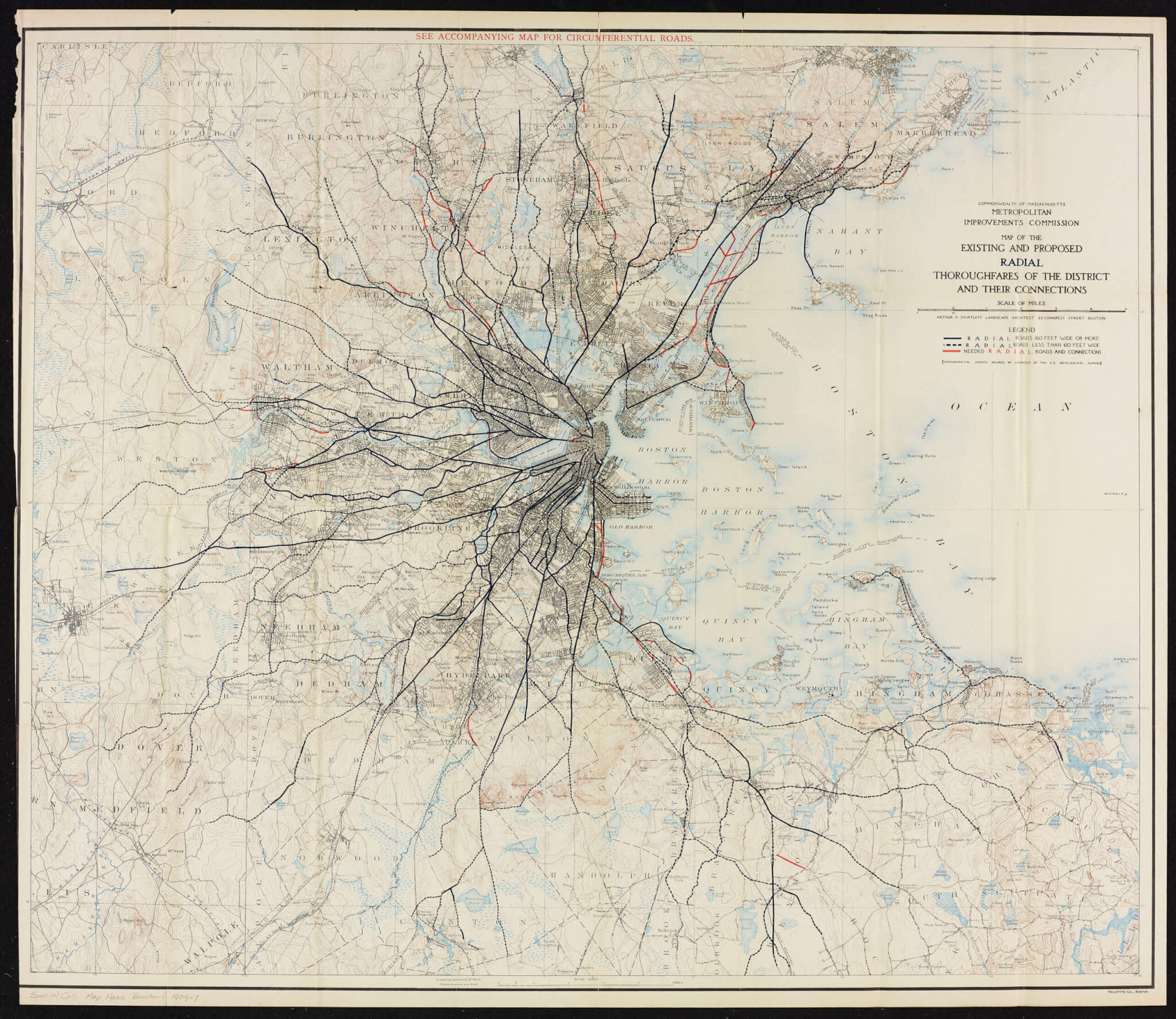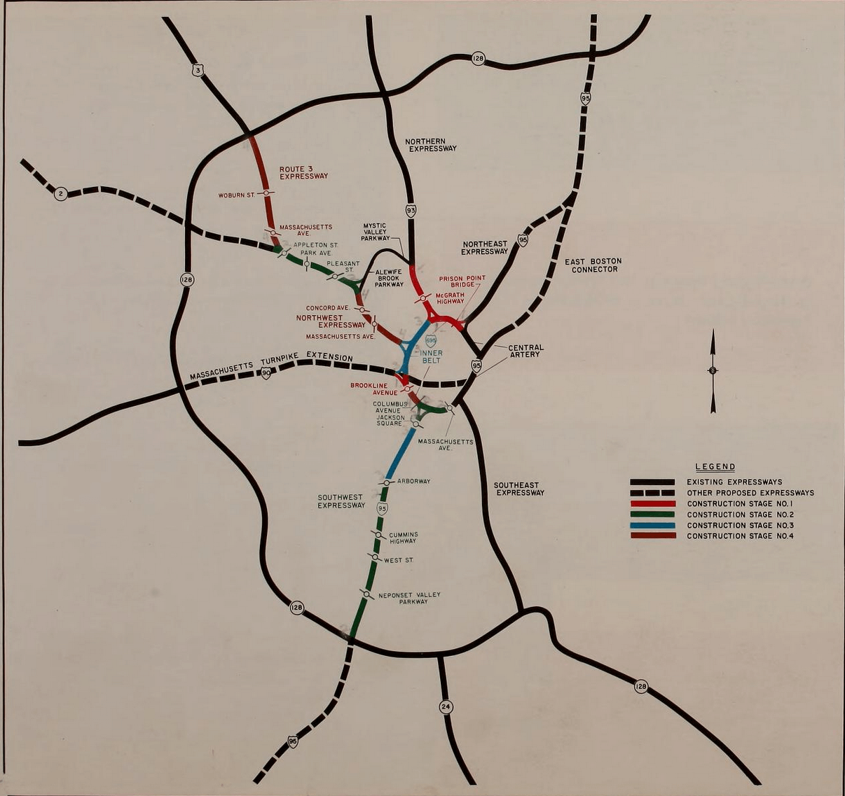 Sources: Boston Globe (May 20, 1962; Jan. 25, 2019); Karilyn Crockett, People Before Highways: Boston Activists, Urban Planners, and A New Movement (University of Massachusetts Press, 2018); Commonwealth of Massachusetts, Inner Belt and Expressway System: Boston Metropolitan Area, 1962; Commonwealth of Massachusetts, The Master Highway Plan for the Boston Metropolitan Area, 1948; Anthony Flint, “Boston’s Highway That Went Nowhere: Lessons from the Inner Belt Fight, 40 Years Later,” bloomberg.com, May 1, 2012; History Cambridge, “Inner Belt Hub” ; Alan Lupo, Frank Colcord, and Edmund P. Fowler, Rites of Way: The Politics of Transportation in Boston and the U.S. City (Little, Brown, 1971); Massachusetts Department of Public Works, “Preliminary Relocation Survey: Roxbury District of the City of Boston,” 1965; Thomas H. O’Connor, Building a New Boston: Politics and Urban Renewal, 1950 to 1970 (Northeastern University Press, 1993); Nancy S. Seasholes, ed., The Atlas of Boston History (University of Chicago Press, 2019); Jim Vrabel, A People’s History of the New Boston (University of Massachusetts Press, 2014); WGBH News podcast, The Big Dig, 2023, episode 1, “We Were Wrong.”