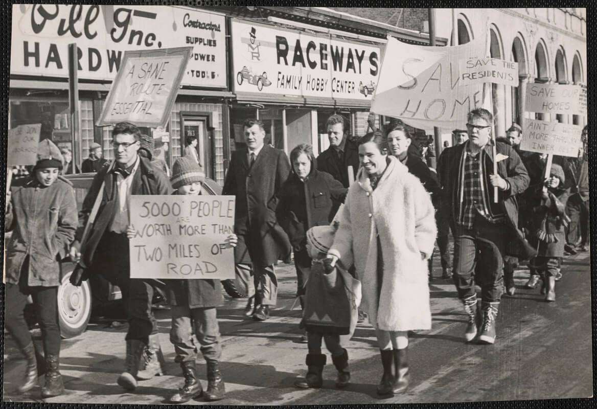 From town to town, people learned about the presumed impact of the Inner Belt. Strongest opposition to the Belt began in Cambridge. Clearing for the Belt would have destroyed 5,000 homes, of which 1,300 would have been in Cambridge. This was 5 percent of Cambridge homes, nearly all of it belonging to the working class. Cambridge businesses employing 4,000 people would have had to close. Meeting with state officials in a Cambridge high school auditorium in May 1960, 2,500 residents chanted, “We don’t want a road. We want our homes.”